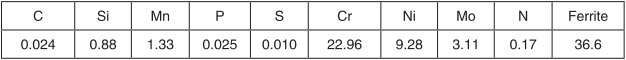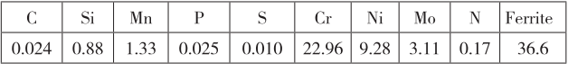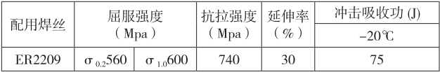 说明:WD-8018 是氟碱型碱性烧结焊剂,碱度约为2.5(BIIW),为乳黄色球形颗粒,直流施焊时焊丝接正极,最大焊接电流可达1200A,粒度为10~50目。该焊剂与焊丝ER2209配套焊接,熔敷金属纯净,烧损元素较少,具有较高的抗拉强度和屈服强度;实验数据满足美国标准(AWS),有比较高的铁素体含量,焊后渣壳翘起,窄间隙脱渣容易,焊缝成形美观,电弧燃烧稳定,抗吸潮性好,颗粒强度高,松装密度小,焊接过程中焊剂消耗量少。